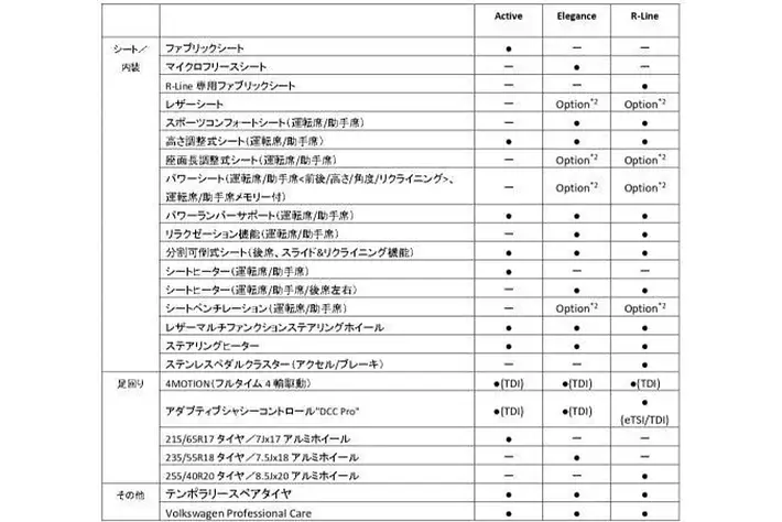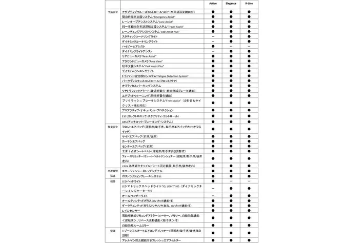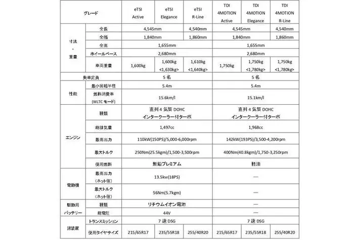 グレードは、1.5L eTSIエンジン、2.0L TDIエンジンともに同一車線内全車速運転支援システム”Travel Assist”やレーンキープアシストシステム”Lane Assist”、 レーンチェンジアシストシステム"Side Assist Plus"などの最新の運転支援システムを標準装備としたエントリーグレード『Active』に加え、LEDマトリックスヘッドライト“IQ.LIGHT HD”や運転席/助手席のシートリラクゼーション機能を標準装備した『Elegance』、そして専用エクステリアを身に纏い、専用シートや20インチアルミホイールを装着した『R-Line』という3グレードを、それぞれのパワートレインと組み合わせて設定し、計6グレード展開となります。