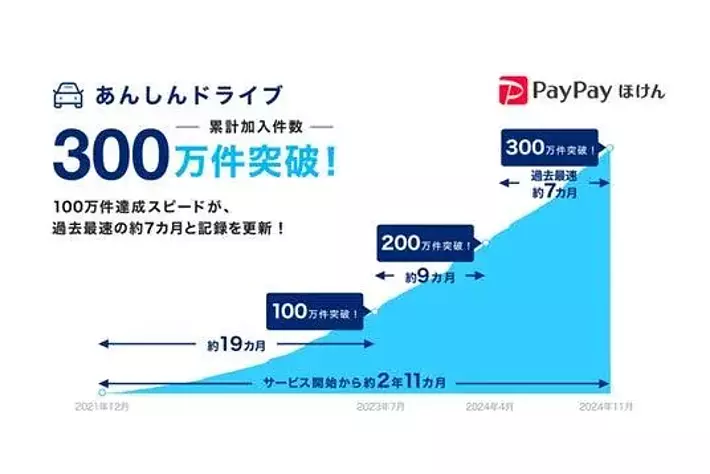 LINEヤフー株式会社(以下、LINEヤフー)のグループ会社である、PayPay保険サービス株式会社(以下、PayPay保険サービス)、Zフィナンシャル株式会社とPayPay株式会社(以下、PayPay)は、キャッシュレス決済サービス「PayPay」内のミニアプリ(※1)「PayPayほけん」で提供している、借りた車での運転中の事故を補償する保険商品「あんしんドライブ(1日自動車保険)」(以下、本保険)の累計加入件数が、2021年12月の提供開始から約2年11ヶ月で300万件を突破しました。また、直近の100万件達成スピードは過去最速の約7ヶ月と記録を更新しています。本保険は18歳から29歳の加入率が約8割を占めており、Z世代を中心に支持されています。