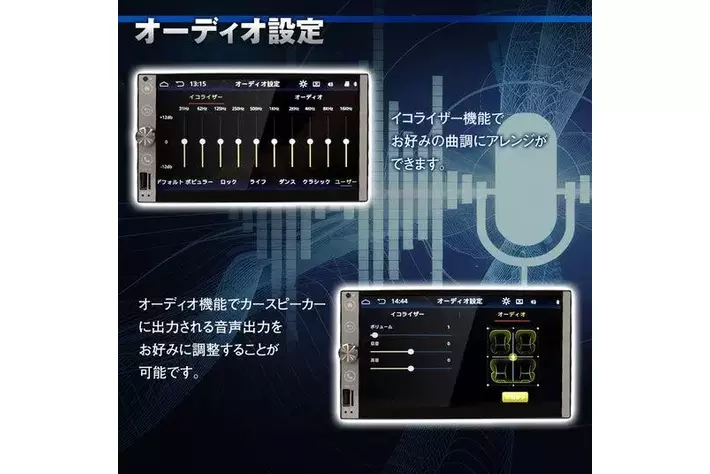 イコライザー機能でお好みの曲調(デフォルト/ポピュラー/ロック/ライフ/ダンス/クラシック/ユーザー)にアレンジができます。オーディオ機能でカースピーカーに出力される音声出力をお好みに調整することが可能です。