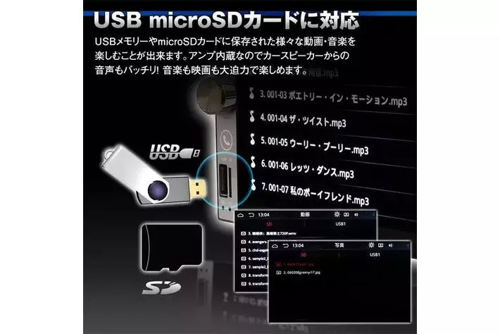 USBメモリーやmicroSDカードに保存された様々な動画・音楽を楽しむことが出来ます。アンプ内蔵なのでカースピーカーからの音声もバッチリ! 音楽も映画も大迫力で楽しめます。