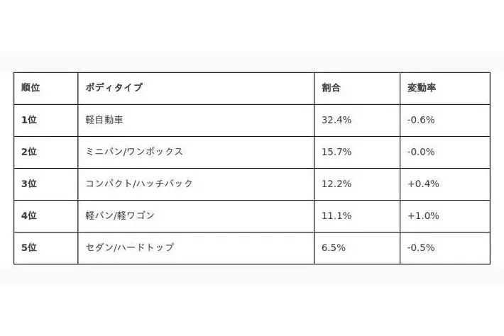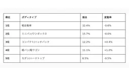 国産車のボディタイプ別ランキングでは、2ヶ月連続でシェアを落としていますが変わらず軽自動車が1位となっています。一方で軽バン/軽ワゴンが1ポイントほどシェアを伸ばしており、コンパクトな車両の人気は依然として高いようです。