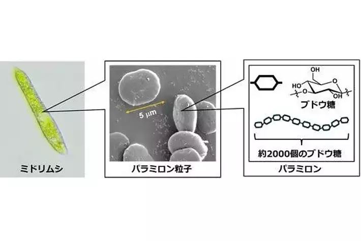 パラミロンはミドリムシの乾燥細胞重量の半分以上の重さになるほど多量にミドリムシ細胞の中に蓄積される生体物質です。パラミロンはブドウ糖が2,000個ほどつながってできた多糖と呼ばれる分子です。ミドリムシの細胞内では多数のパラミロンが寄り集まって形成された、直径が数マイクロメートルの粒子として存在しています(図1)。