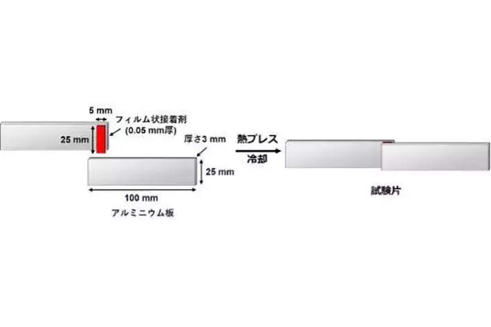 次にこのフィルムを5×25 mmの大きさに切り出し、レーザー処理をしたアルミニウム合金(A6061)製の板(100×25×3 mm)の端に置き、さらにもう一枚の同様の処理をしたアルミニウム板をフィルムに重ね合わせるように置いたのちに、熱プレス、つづいて冷却することで2枚のアルミニウム板が接着された試験片を作成しました(図3)。