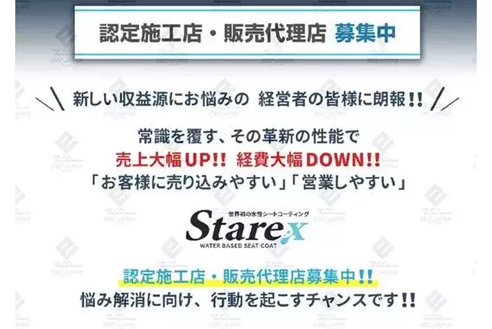 Starexシートコーティングの統括元である株式会社and CLEA(以下、「当事業所」と称します)の渡邊です。現在、当社では長期的かつ、ワンランク上のビジネスパートナーとしてご協力いただける事業者様を募集しております。募集は以下の2種類の形態となります。Starexシートコーティングを【BtoB販売できる販売代理店】およびBtoCでStarex【シートコーティングの施工ができる認定施工店】です。Starexシートコーティングは、エンドユーザーの愛車を守りその価値を高め、また、カーディテイリング業界の活性化に貢献すると自信を持ってお勧めできる商品です。お客様に喜びと安心を体感いただけることで、高いリピート率の信頼関係を構築いただければ幸いです。今回の募集にあたり、公式HPにて「商材の概要と強み」を解説した上で、新規事業での優位性などをご案内しております。