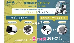 2024年12月11日(水)~2025年1月31日(金)の期間、ブレイズの電動バイク『EV DELIVERY(以下、EVデリバリー)』をお買い求めのお客様に、オプション品の、積載BOX110Lと、電動空気入れをプレゼント!