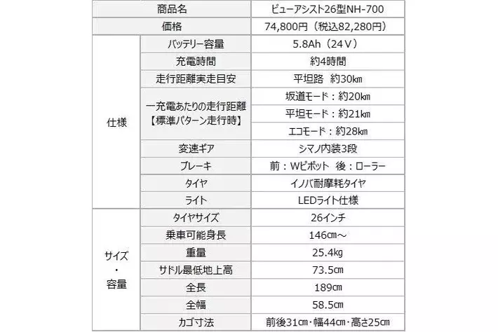 大型のカゴ・またぎやすいフレーム形状・チェーン外れの少ない内装3段変速など、普段使いに便利な機能を搭載しながら、税抜74,800円(税込82,280円)という価格を実現しました。ちょっとしたお買い物など近距離移動にちょうどいいバッテリー容量の電動アシスト自転車です。