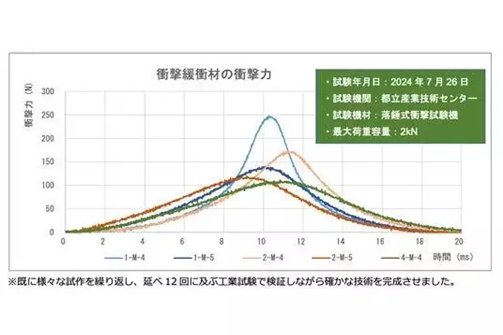 工業試験では、異なる三種の素材を組み合わせ 衝撃力を測定しましたが、何れも基準値となる300Nをクリアし、確かな効果を元に商品化を開始することに至りました。