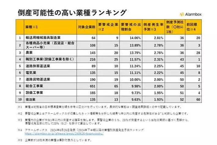 AI与信管理サービスを提供するアラームボックス株式会社(本社:東京都新宿区、代表取締役:武田浩和、以下「当社」)は、この度、2023年12月1日~2024年11月30日の期間に収集された13,697社・225,595件のネット情報等から1年以内に倒産する危険性がある“要警戒企業”を分析・抽出し、「倒産危険度の高い上位10業種」を予測しましたので発表します。