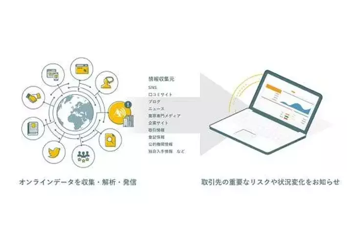 AI与信管理クラウドサービス「アラームボックス」( https://alarmbox.jp )は、企業や自治体のHPに掲載された情報や、SNSや口コミなどインターネット上で投稿された情報をAI技術で収集・解析し、提供するクラウドサービスです。新規取引時の与信判断、既存取引先の継続的な与信管理、さらに売掛保証までを一括して行うことができます。収集・判断の難しいネット上の情報を、与信への影響度を診断したうえで提供するため、インターネット上の情報を活用した高精度な与信管理を、簡単に、低価格で導入できます。これにより、取引先の情報収集に関わる業務負荷を大幅に削減し、スマートフォンやPCから取引先を登録しておくだけで、迅速にリスクに対応できます。
