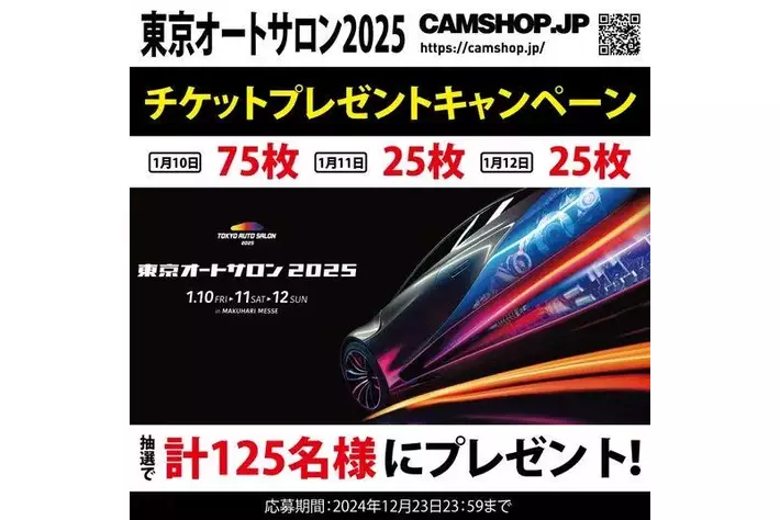 ノリモノ雑貨ブランド「CAMSHOP.JP」(株式会社フェイス)は、2025年1月10日(金)~12日(日)に幕張メッセで開催される 「東京オートサロン2025」 の出店を記念し、合計125名様に入場チケットをプレゼントするキャンペーンを開始しました。