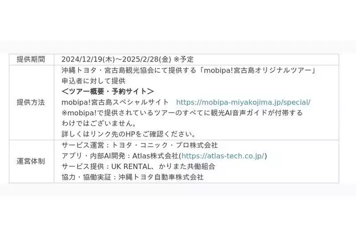 『OTOMO-NAVI』は、沖縄トヨタならびに一般社団法人宮古島観光協会(沖縄県宮古島市、会長:吉井 良介、以下「宮古島観光協会」)と連携し提供される、mobipa!宮古島オリジナルツアー「地域の暮らしと交差する旅」*の対象ツアーにお申し込みいただいた方にご提供いたします。