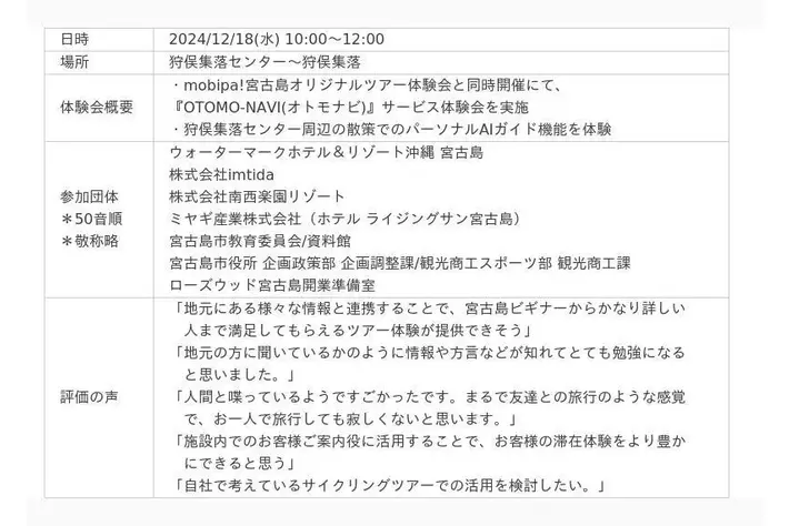 実証開始に先立ち、12月18日(水)に行われた現地観光事業関係者向けmobipa!宮古島オリジナルツアー体験会にて、『OTOMO-NAVI』体験会を同時開催いたしました。本体験会の参加者からは「地元の方に聞いているかのように観光の情報や方言などが知れてとても勉強になると思いました。」「人と喋っているようですごかったです。まるで友達との旅行のような感覚で、お一人で旅行しても寂しくないと思います。」「地元にある様々な情報と連携することで、宮古島ビギナーからかなり詳しい人まで満足してもらえるツアー体験が提供できそう」などの観光に限らず、教育・文化領域においても一定の期待をいただきました。など、観光に限らず、教育・文化領域においても多くの期待を寄せるお言葉をいただきました。