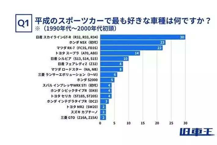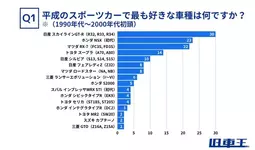 ・調査内容:Q1. 平成のスポーツカーで最も好きな車種は何ですか?※(1990年代~2000年代初頭) Q2.Q1で選んだ平成スポーツカーの最も魅力に感じる点は何ですか?※複数選択可