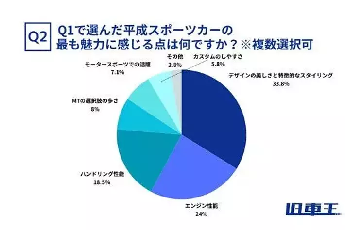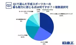 Q1で選んだ平成スポーツカーの最も魅力に感じる点について聞いてみると、総合的に最も多かった回答は「デザインの美しさと特徴的なスタイリング」33.8%、次いで「エンジン性能」24.0%、3位が「ハンドリング性能」18.5%という結果になりました。