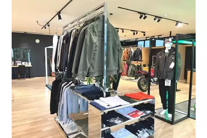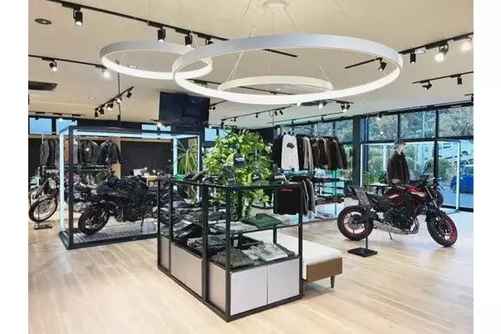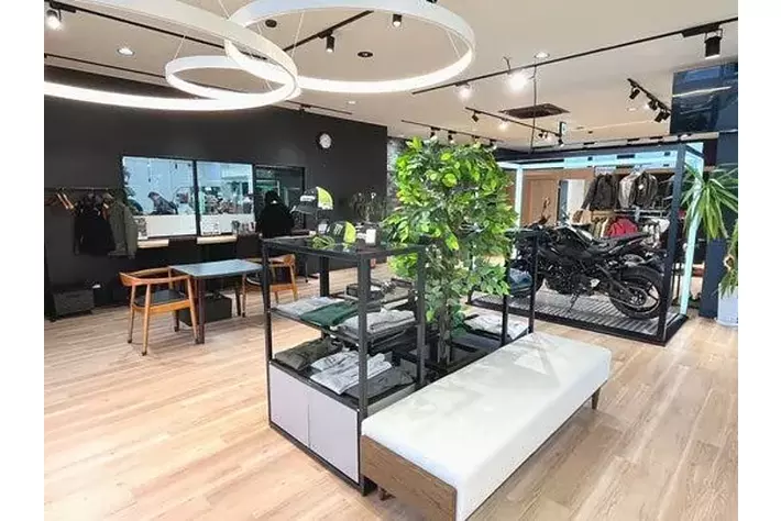 木目調のフロアと白い天井が織りなす明るい店内。モーターサイクルとプラザアパレルがゆったりと展示され、どなたでも楽しめる空間としています。