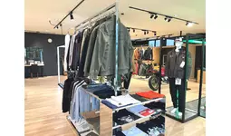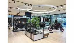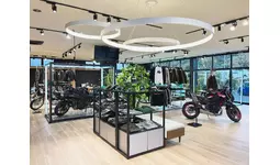 木目調のフロアと白い天井が織りなす明るい店内。モーターサイクルとプラザアパレルがゆったりと展示され、どなたでも楽しめる空間としています。