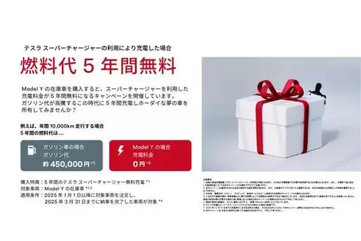 2025年の新たなお年玉キャンペーンとして、Model Yの新車在庫車をご購入されたお客様へ、納車後5年間無料でスーパーチャージャーをご利用いただける特典