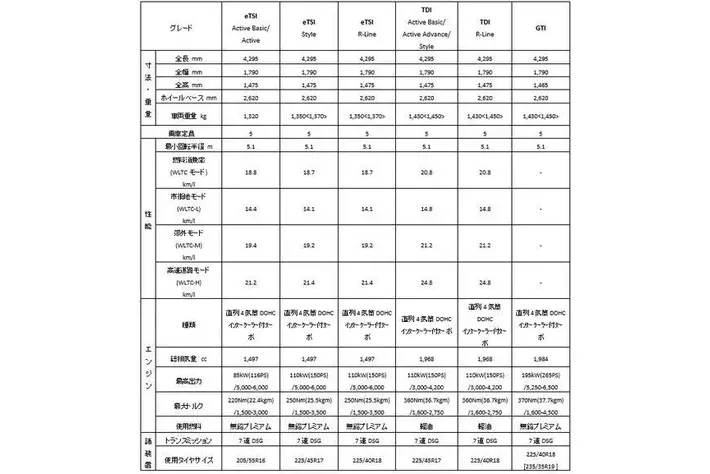 パワートレインは、48Vマイルドハイブリッドシステムを採用する1.5L eTSI直列4気筒ガソリンエンジン(85kW/116PSと110kW/150PSの2種類を設定)に加え、デュアルAdBlue噴射機構「ツインドージングシステム」を備える2.0L TDI直列4気筒クリーンディーゼルエンジン(110kw/150ps)を設定しています。さらにハッチバック伝統のスポーツグレード「GTI」には、最高出力が従来比20PSアップした2.0 L TSI 直列4気筒ガソリンエンジン(195kW/265PS)がラインナップされます。