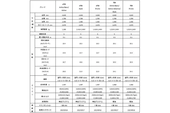 これまで「Active」には1.0eTSI、StyleとR-Lineには1.5eTSIが搭載されていましたが、新型からは3つのパワートレインで排気量は同じ1.5リットルとなり、制御による出力違いユニットとなります。これにより「Active」は直列3気筒エンジンから4気筒エンジンへアップグレードとなり、出力も4kW/20Nmの強化となります。