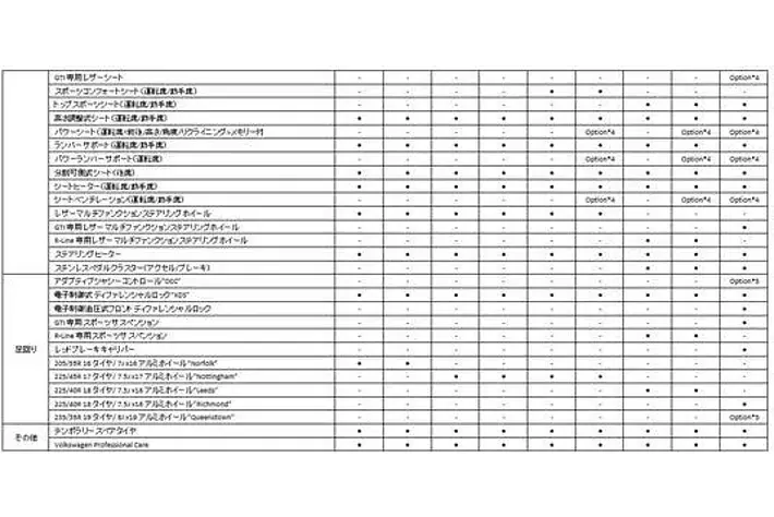 *4:レザーシートパッケージ(グレードにより専用デザイン。*1、*2とセットオプション。GTIではさらに*5とセットオプション)