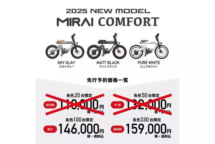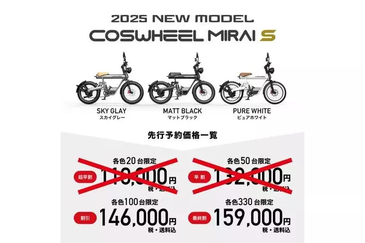 COSWHEEL MIRAI S / MIRAI COMFORTの超早割110,000円(税込)と早割132,000円(税込)の合計420台はすべて完売。現在は両機種とも割引146,000円(税込)で先行予約受付中です。