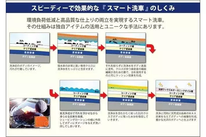 その手法は、従来のガソリンスタンドや洗車専用施設などのそれとは大きく異っており、新しいスタイルの「スマート洗車」を実施。バケツ1杯未満のオリジナル洗浄水だけで短時間に来場者の愛車を極上の仕上りにするサービスを行っている。