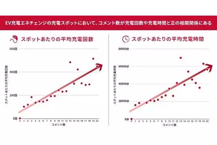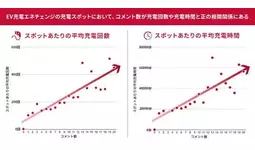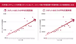 2024年12月1日時点で、EV充電エネチェンジの対象充電スポット(2024年8月31日以前に利用開始)*1の1,288スポットのうち、1,283スポットに1件以上のコメントが投稿され、カバー率は99.6%を達成しました。また、コメントが多いスポットほど稼働率が高い傾向が見られ、充電器の利用促進に寄与しているといえます*2。