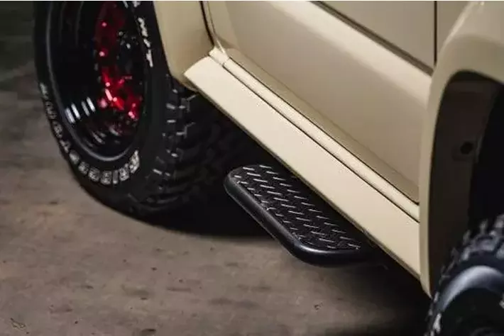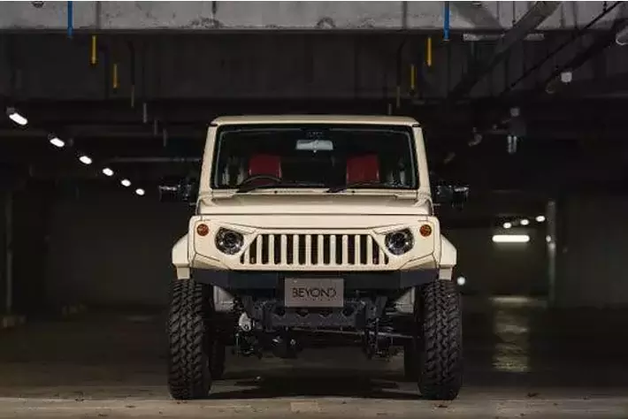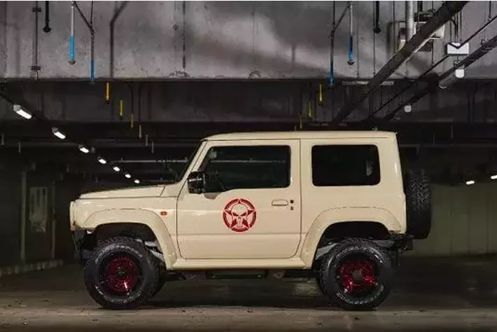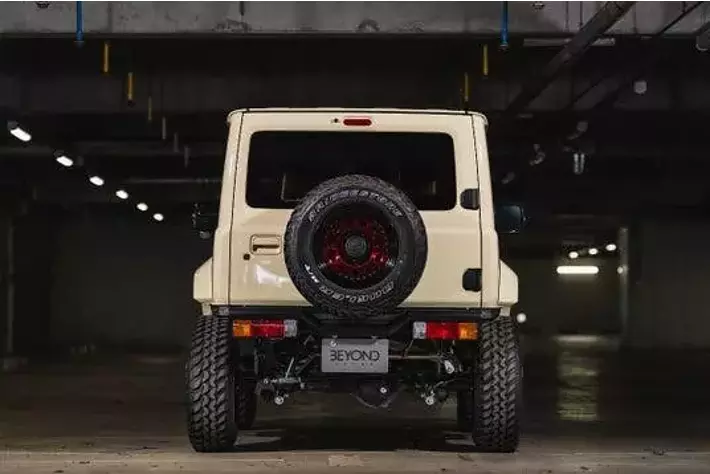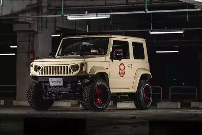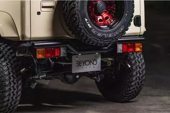 ラングラーのバッドフェイスグリルを彷彿とさせる「フェイスグリルソルジャー」と、シンプルな「バンパーレスエプロン」を組み合わせたスタイルは、ジムニーに新たな個性を与えます。