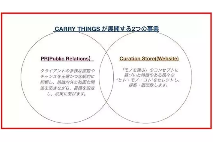 私たちCARRY THINGSは「モノを運ぶ」をコンセプトにしたPR(Public Relations)事業と、キュレーション ストアと名付けたEC事業の2つを連携して運用していきます。