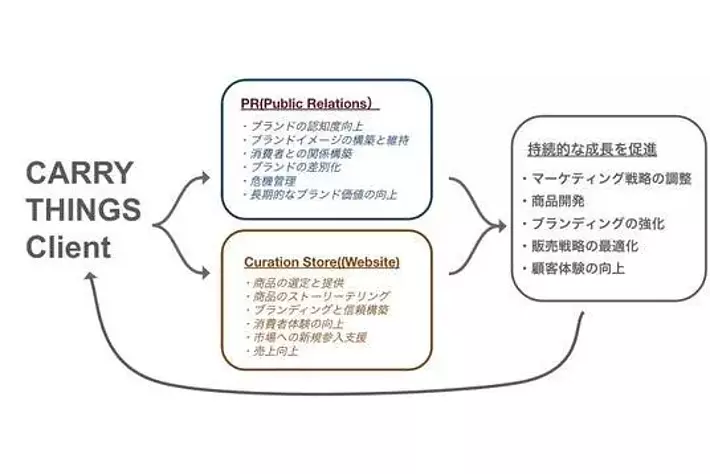 ブランド訴求と売上向上を目的にしたPR活動と、キュレーション ストア「CARRY THINGS」内でお預かりした商品の販売させていただきます。