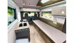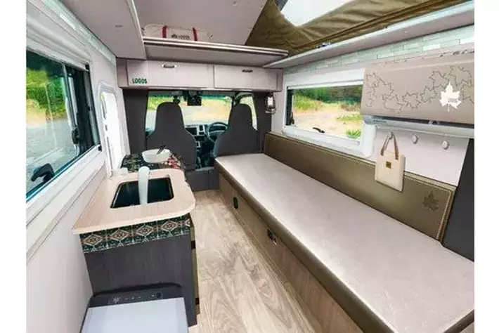 車内はベッドにもなるベンチソファが右側にレイアウトされ、エントランス側にシンクを配置。シンク側には3通りの取り付けができる、取り外し可能なテーブルも装備しています。リアサイドには、特別なグラフィックが施されたエアコンも装備可能です。