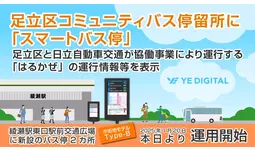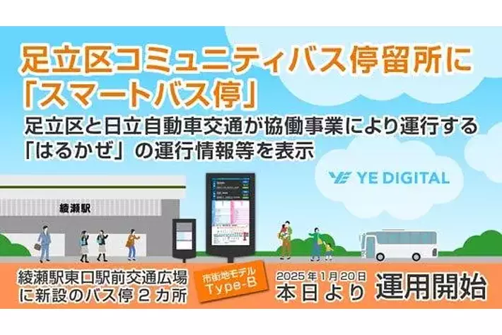 株式会社YE DIGITALが提供する「スマートバス停」は、この度、日立自動車交通株式会社(※1、以下 日立自動車交通)と足立区によって導入され、同区で運行している足立区コミュニティバス「はるかぜ」の綾瀬駅東口駅前交通広場に新設されるバス停のうち2カ所において、2025年1月20日より運用開始いたします。