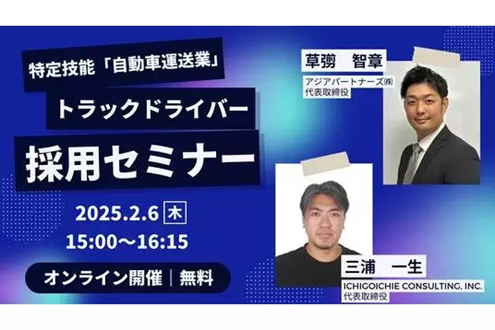 ICHIGOICHIE CONSULTING, INC.(本社:フィリピン、代表取締役:三浦一生)とアジアパートナーズ株式会社(本社:千葉県、代表取締役:草彅智章)は、2025年2月6日(木)特定技能の外国人トラックドライバーの採用に特化した無料オンラインセミナーを開催します。