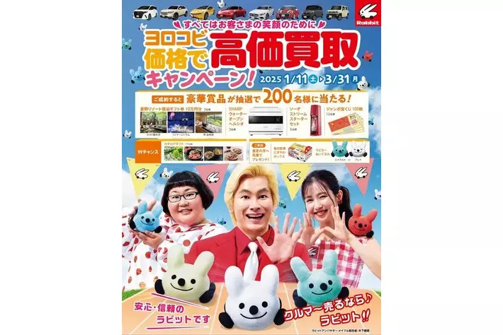 株式会社ラビット・カーネットワーク(本社:東京都江戸川区臨海町、代表取締役社長:山中 雅文)が運営する自動車買取・販売の「ラビット」では1月11日(土)~3月31日(月)まで『ヨロコビ価格で高価買取キャンペーン!』を実施いたします。