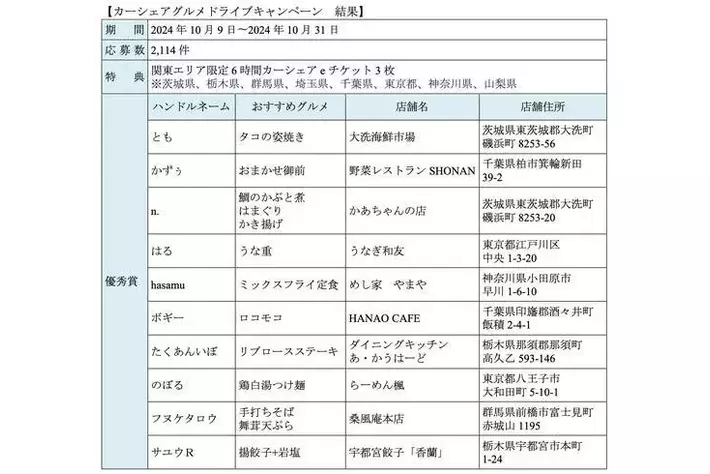 結果発表ページ:https://share.timescar.jp/campaign/gourmet_1st/