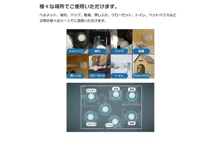 ヘルメット、車内、バッグ、靴箱、押し入れ、クローゼット、トイレ、ペットハウスなど様々なシーンでご活用いただけます。