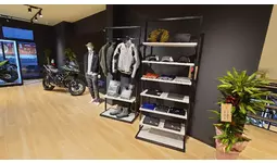 木目調のフロアと白い天井が織りなす明るい店内。モーターサイクルとプラザアパレルがゆったりと展示され、どなたでも楽しめる空間となっています。