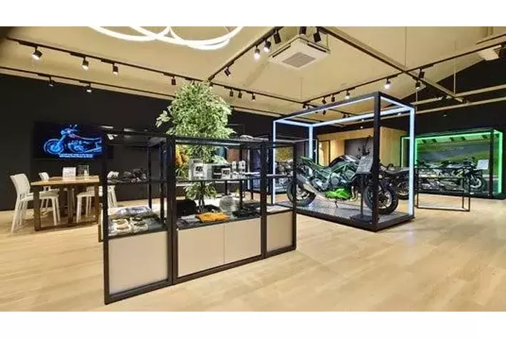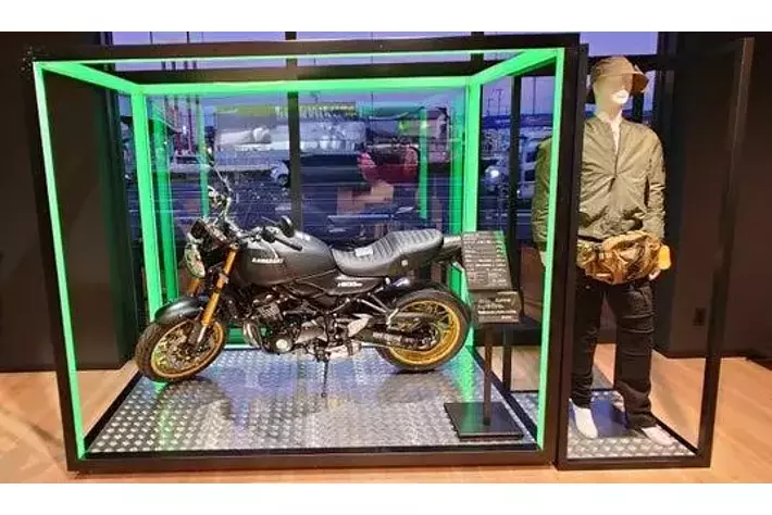 新たなオーナーを待つモーターサイクルたちが、ケージの中で静かに眠りについているイメージを光の枠で創出。カワサキ プラザならではのアイコニックポイントの一つです。