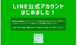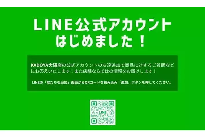 今回のグランドOPENに際し、特別な体験と利便性の高さを兼ね備えた店舗づくりをコンセプトに計画いたしました。その一環として、KADOYA大阪店ではLINE公式アカウントをご用意いたしました。このアカウントでは、店舗へのお問い合わせや、サービス・商品に関するご質問などをお気軽にご利用いただけます。ぜひ、LINE公式アカウントをご活用ください。
