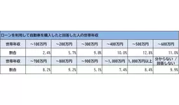 ローンを利用して車を購入した人の属性を見てみると、30~40代が多く、中でも40代は全回答者の40%以上となりました。また、世帯年収別に見ると「400万円~600万円」の回答が多い結果となりました。