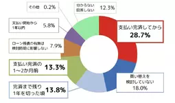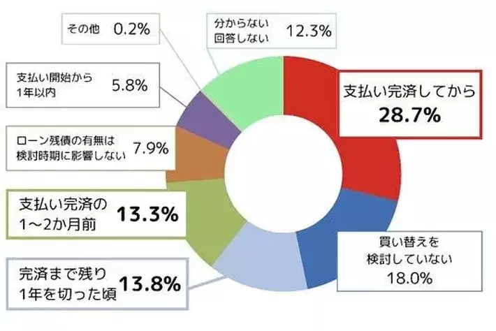 車は年数が経つほどに買取価格が下がるため、リセールバリューを考えて「いつ売却するか」を検討するユーザーも多く見られます。そのような理由からか、買い替え時期を「支払い完済の1~2か月前(13.3%)」「完済まで残り1年を切った頃(13.8%)」とローンの支払いを終え切らずに買い替えを検討している人も多く、中には「支払い開始から1年以内(5.8%)」と早めに検討を開始した人も一定数見られました。