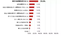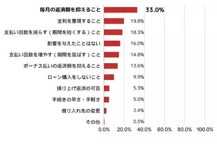 ローン経験者に、過去の経験から次回以降のローンで重視するポイントを聞くと、「毎月の返済額を抑えること」という回答が33.0%で最も多い回答となりました。近年は物価高騰しており、ローンの返済をしながら生活水準を保っていくためには月々の支払額を抑える必要があるという考え方が今回の結果に繋がったことが予想されました。
