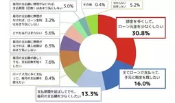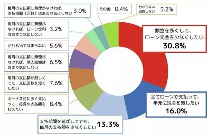 - ローンを組む際の考え方として、「頭金を多くしてローン元金を少なくしたい」という回答が30.8%と最も多くなりましたが、「全てローンで支払って、手元に現金を残したい」と考える人も16.0%で2番目に多く、ローンの初期費用に関しては様々な考え方があることがわかりました。