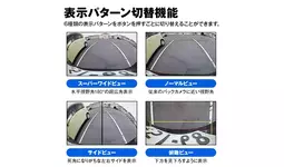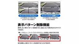 超広角180°のスーパーワイド表示、従来のバックカメラに近い画角のノーマル表示、死角になりがちな左右サイド拡大表示、下方を俯瞰表示、さらにスーパーワイド+左右サイド分割表示、スーパーワイド+下方の分割表示の6種類の表示パターンを切り替えることができます。