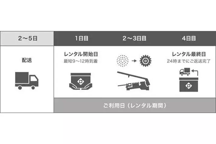 製品はご指定のレンタル開始日にお届けいたします。ご使用後、レンタル最終日までに製品のご返送手続きを完了してください。ご返送の際は同梱してある着払い伝票を使用してください。