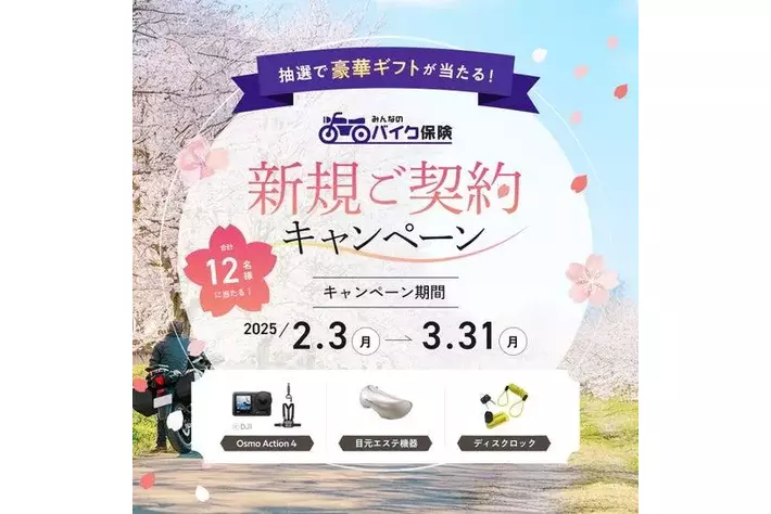 「みんなのバイク保険」を提供しているSBI日本少額短期保険株式会社(本社:大阪市北区、代表取締役社長:井上 久也、以下「当社」)は、2025年2月3日(月)から「抽選で豪華ギフトが当たる! みんなのバイク保険 新規ご契約キャンペーン」を実施いたします。