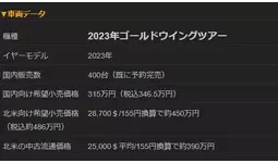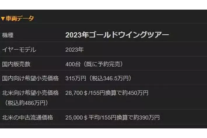具体的には、北米の現行GOLD WING TOURの税抜メーカー希望小売価格は28,700$であり155円換算で約450万円(売上税込み480万円)である。 仮に業者間オークションにおいて360万円で仕入れると日本の消費税10%に輸入関税2.4%や輸送費が加わり、北米での2023年モデルの中古平均価格25,000$(約390万円)に対して競争力がない。 HONDAがGOLD WINGを正規販売している国では360万円の仕入れ値は為替差益を考慮しても割に合わない。