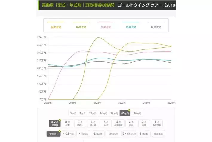 年式別のゴールドウイングツアーの買取相場の推移