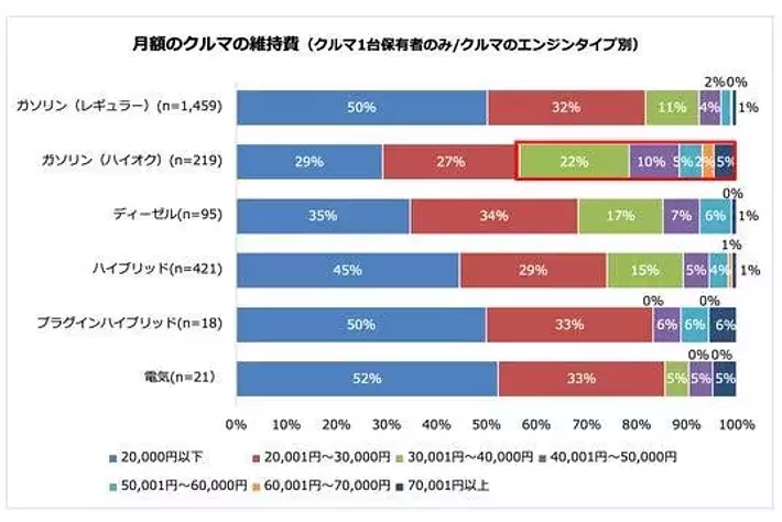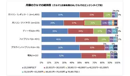 保有するクルマのエンジンタイプ別に見ると、「ガソリン(レギュラー)」「プラグインハイブリット」「電気」の8割以上は月額のクルマの維持費が30,000円以下となったのに対し、「ガソリン(ハイオク)」は30,001円以上の割合が唯一40%を上回りました。ハイオクガソリンはレギュラーガソリンより20~30円/Lほど価格が高いほか、排気量が大きいハイオク仕様車は自動車税が高いことが影響していると思われます。