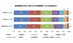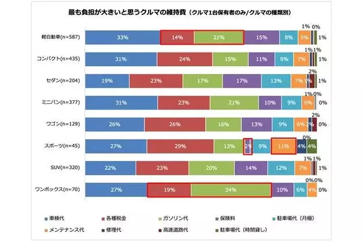 保有しているクルマの種類別では、軽自動車とワンボックスは「ガソリン代」が「各種税金」を上回りました。スポーツは唯一「保険料」が10%を下回った一方で、「メンテナンス代」が10%を超えました。